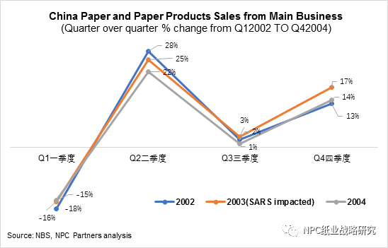 根据NPCPartners咨询公司的分析,SARS对于中国造纸行业在2003年影响非常有限。2003年中国造纸和纸制品行业主营业务收入约2432亿元人民币,年同比增长达到24%。从季度环比来看,主营业务收入增长速度和行业周期循环特点基本相符(图1), 2003年SARS疫情最严重的第二季度与前一年和后一年走势变化也不大。