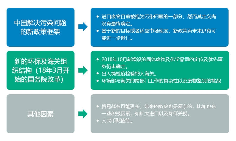 监管趋势目前还面临着进一步的加强:2018年6月16日,中共中央及国务院共同发布的《关于全面加强生态环境保护 坚决打好污染防治攻坚战的意见》中还提及了:“强化固体废物污染防治。全面禁止洋垃圾入境,严厉打击走私,大幅减少固体废物进口种类和数量,力争2020年年底前基本实现固体废物零进口。” 而与此同时,新组建的中国环境保护部的组织结构改革也还在进行之中。但废纸究竟被视作污染问题或者可循环回收利用的环保资源,目前的官方定义还尚未明确。