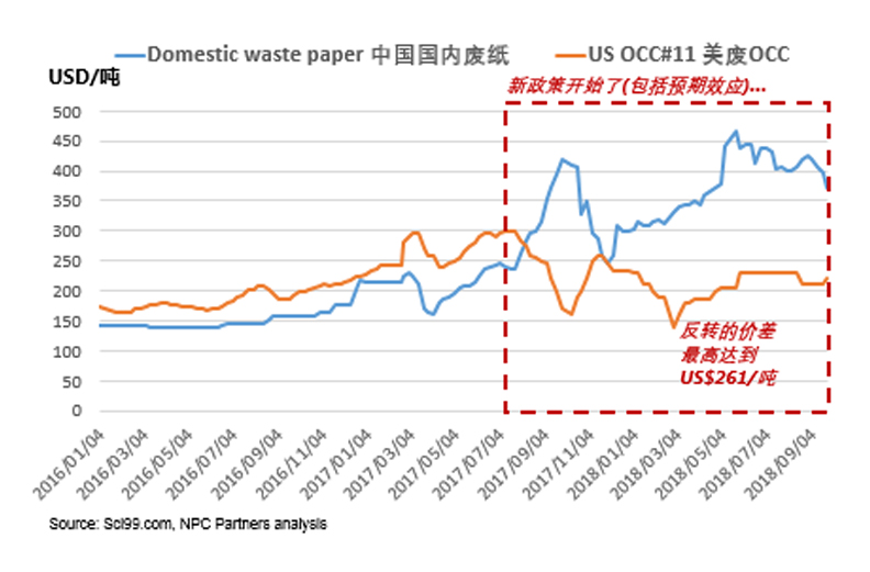 进入2018年以来,废纸进口新规及关于固废进口管理的政策方向已经对造纸行业产生了重大的影响,包括国内国外废纸市场出现的价格波动。废纸进口的新规定主要变化是混合废纸的进口禁令,对于未禁止废纸种类含杂率更低的上限,以及进口许可证现在要求申请人至少有5万吨的纸生产能力(贸易商不再有申请资格)。NPC Partners认为这反映出中国政府通过逐步淘汰质量最差的等级(可能含有较高含量的污染物)并采用新的监测方法来评估年度进口总量,从而加强了对废纸进口总量的控制。